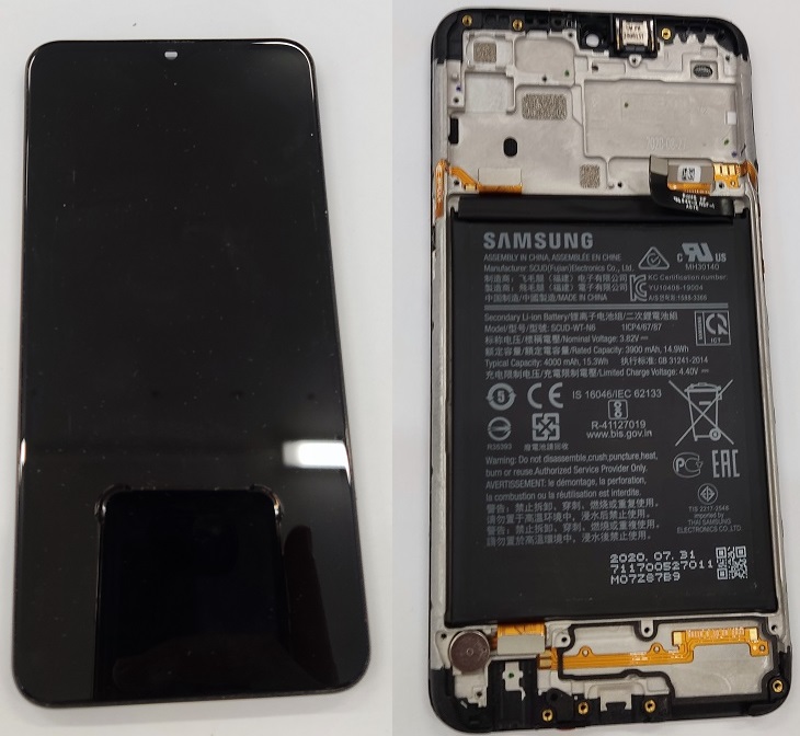 Samsung A107 Galaxy A10s előlap keret, lcd kijelző és érintőpanel akkumulátorral, fekete, BONTOTT karcmentes